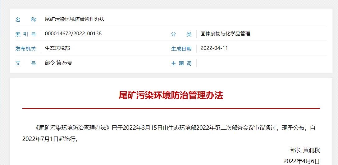 省級(jí)生態(tài)環(huán)境主管部門(mén)負(fù)責(zé)確定本行政區(qū)域尾礦庫(kù)分類分級(jí)環(huán)境監(jiān)督管理清單,并加強(qiáng)監(jiān)督管理。